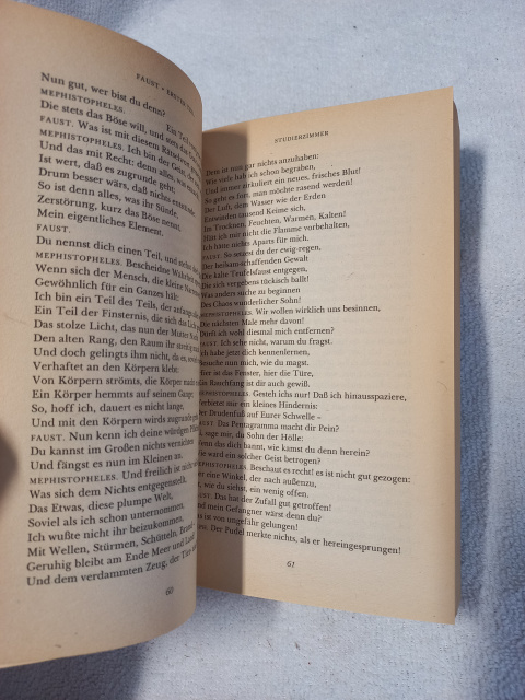 Der Universalgelehrte Faust befindet sich in einer tiefen Krise bei seiner Suche nach dem, »was die Welt im Innersten zusammenhält«. Eingesperrt in seine Gelehrtenstube drängt es ihn schließlich bis nahe an den Selbstmord. Nur die Osterglocken retten ihn. Beim berühmten Osterspaziergang wird ihm bewusst, dass er sich nach umfassendem Weltwissen gleichermaßen wie nach irdischer Weltlust sehnt. Da er sich aber von allen irdischen Lebenswerten abgeschnitten sieht, verflucht er das Leben. Hier nun wittert der Teufel in Gestalt des Mephisto seine Chance und bietet Faust einen Pakt an: Würde dieser auch nur einen Augenblick das Leben genießen und dabei verweilen wollen, wäre Fausts Seele auf immer verloren.
