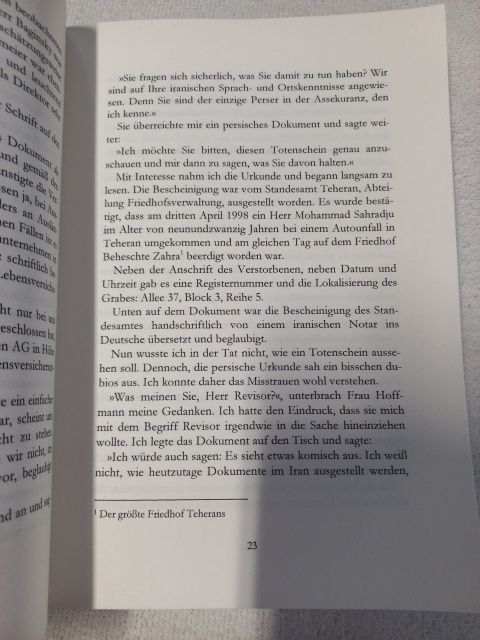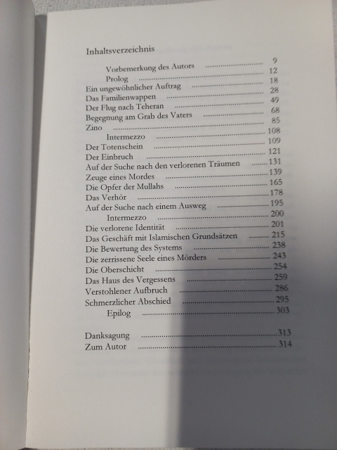 Cyrus gehört der adligen iranischen Familie Salaar an. Sein Vater war ein exzellenter und bekannter Chirurg zur Zeit des Schah-Regimes, wurde aber in den Wirren der Revolution ermordet, das gesamte Vermögen vom Staat konfisziert. Die Familie floh und lebt seither in alle Welt verstreut im Exil. Cyrus Salaar ist inzwischen deutscher Staatsbürger und arbeitet bei einem Versicherungskonzern in Hamburg. Dieser beauftragt ihn, die Richtigkeit des Totenscheins eines iranischen Versicherungsnehmers in Teheran zu überprüfen; es wird ein Versicherungsbetrug vermutet. Der Protagonist hat auch ein privates Interesse, diese nicht ungefährliche Dienstreise ins Land der Mullahs anzutreten. Er will die Gelegenheit nutzen, wieder in den Besitz des Familienwappens der Salaars zu gelangen - es hatte bei der Flucht zurückgelassen werden müssen. In seinem ehemaligen Elternhaus, einer alten Villa, residiert jetzt allerdings die Geheimpolizei... Ein authentischer, spannender Roman aus dem Reich der Mullahs!