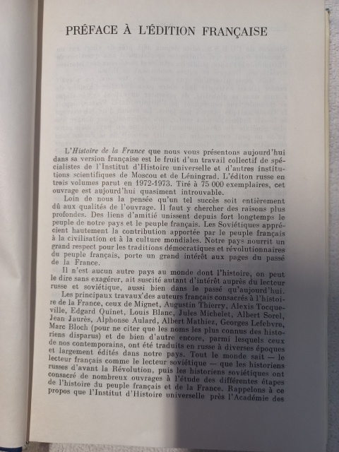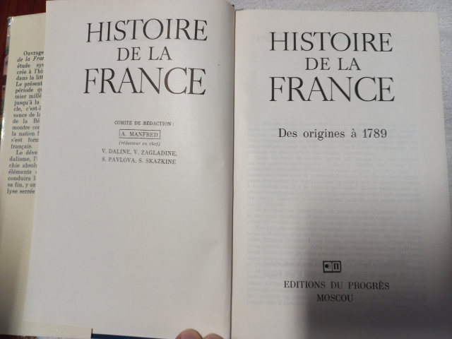 Ouvrage collectif, l'Histoire de la France est la première étude systématique consa-crée à l'histoire de ce pays, dans la littérature soviétique. Le présent volume couvre la période qui s'étend du pre-mier millénaire de notre ère jusqu'à la fin du XVIII siè-cle, c'est-à-dire, de la nais-sance de la France à la veille de la Révolution. Il nous montre comment est apparue la nation française, comment s'est formé l'Etat national français.