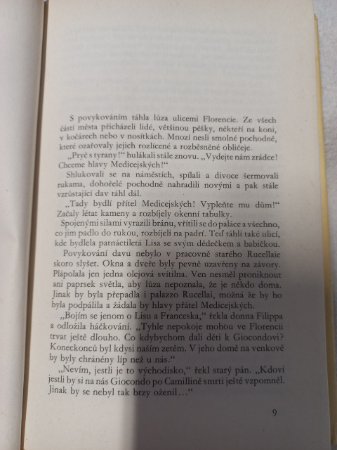 Po dlouhá staletí se táží všichni, kteří spatřili nezapomenutelný úsměv na portrétu známém jako Mona Lisa či La Gioconda, koho vlastně tehdy Leonardo da Vinci portrétoval. Co znamenal tento úsměv? V autorské fabulaci se spisovatel pokusil podat jedno z možných vysvětlení. Vedle romantické dějové linie o nenaplněné lásce k jednomu z rodu Medicejských a marném pokusu ženy aspoň jednou se ještě vzepřít vynucenému životu po boku manžela vybraného jinými se odvíjí ještě linie druhá: dobová freska Itálie, uměleckého světa a střetů dvou velikánů Leonarda da Vinciho a Michelangela Buonarrotiho i života, přání, tužeb a snah prostých lidí, jejich hledání sebe sama i odvěkých hodnot dobra a zla.