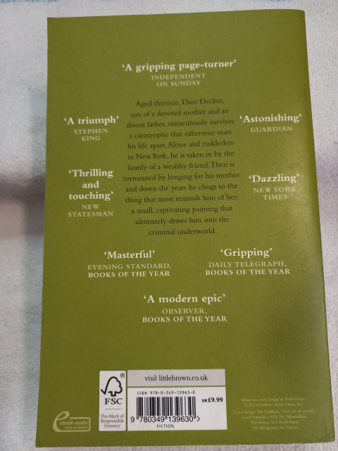 Aged thirteen, Theo Decker, son of a devoted mother and a reckless, largely absent father, survives an accident that otherwise tears his life apart. Alone and rudderless in New York, he is taken in by the family of a wealthy friend. He is tormented by an unbearable longing for his mother, and down the years clings to the thing that most reminds him of her: a small, strangely captivating painting that ultimately draws him into the criminal underworld. As he grows up, Theo learns to glide between the drawing rooms of the rich and the dusty antiques store where he works. He is alienated and in love - and his talisman, the painting, places him at the centre of a narrowing, ever more dangerous circle.