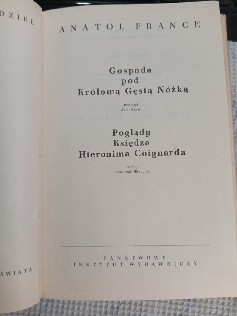 Gospoda Pod Królową Gęsią Nóżką to wesoła, satyryczna opowieść tocząca się w XVIII wieku, którego jest żywym obrazem, z jego bujnością, zamiłowaniem do "nauk tajemniczych" i lebertynizmem.Centralną postacią jest ksiądz Hieronim Coignard, humanista, stoik z przekonania, epikurejczyk z obyczajów, moralista wyrozumiały dla siebie i innych, traktowany przez autora z równą dozą ironii jak i sympatii.